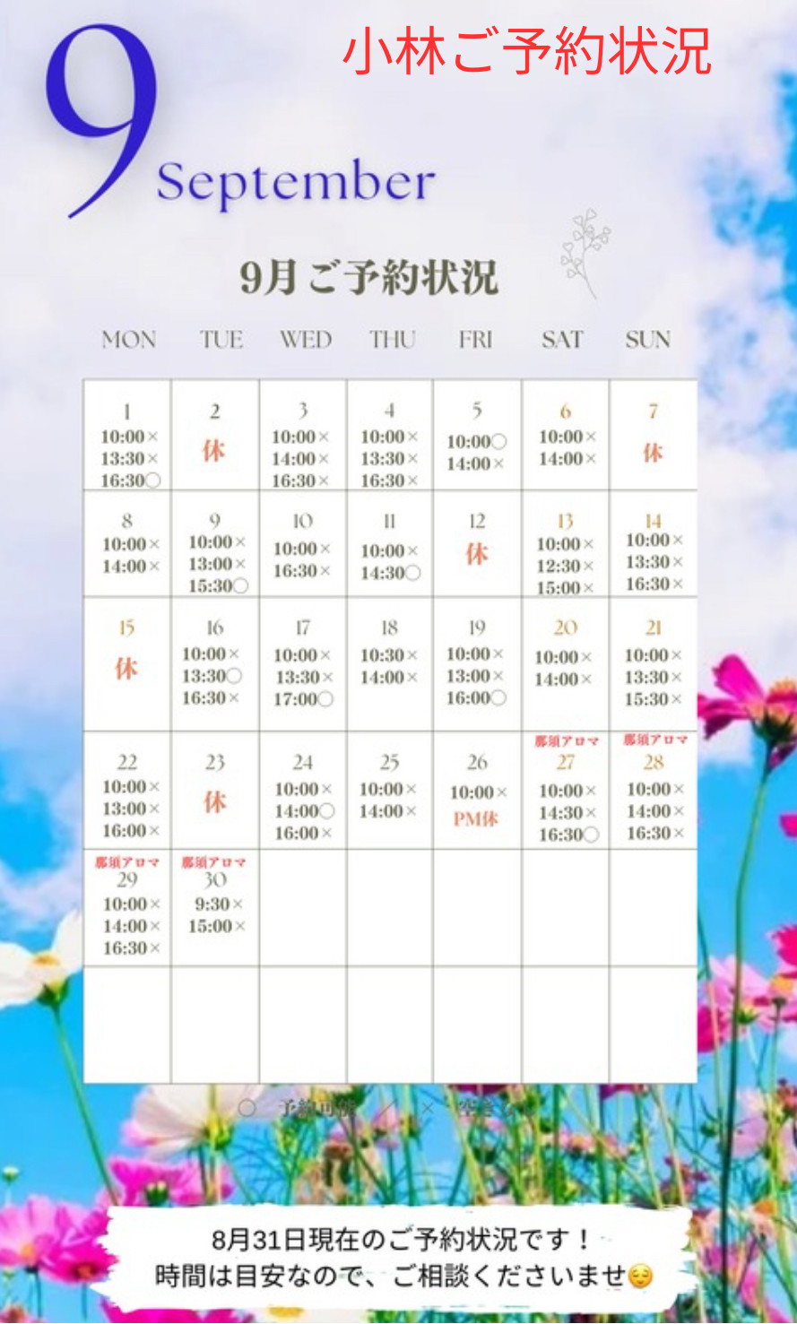 8月のご予約状況をアップしました🌿 ご参考にしてくださいませ。