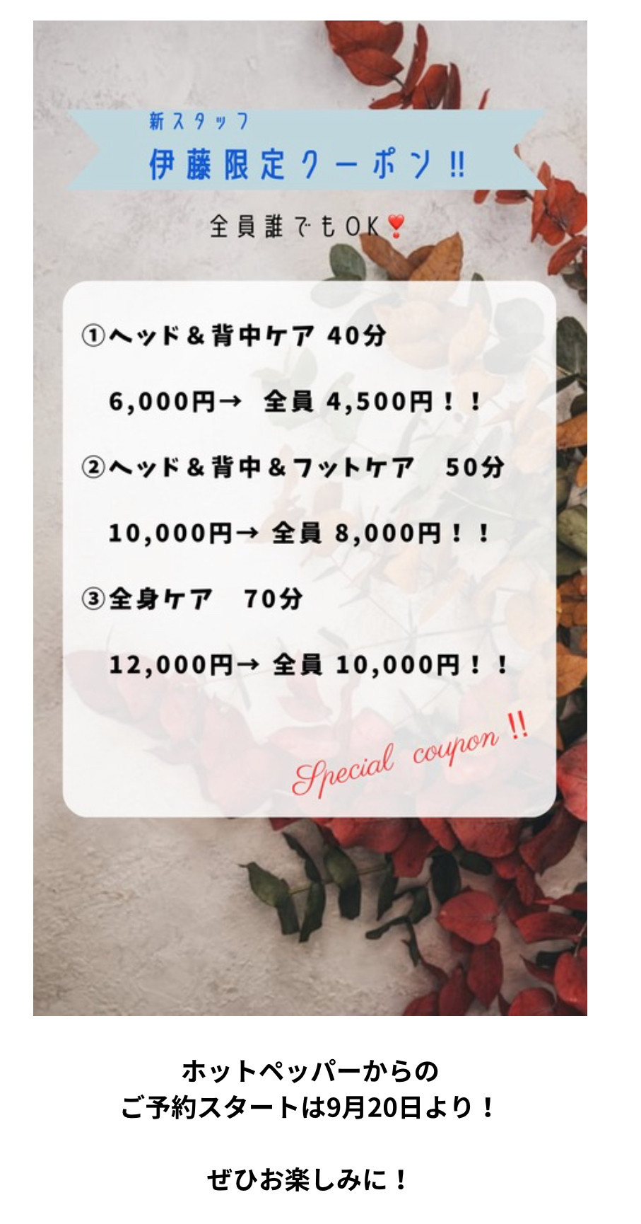 11月までは 「新スタッフ限定キャンペーン」を実施予定ですので、ぜひご利用くださいませ😌
