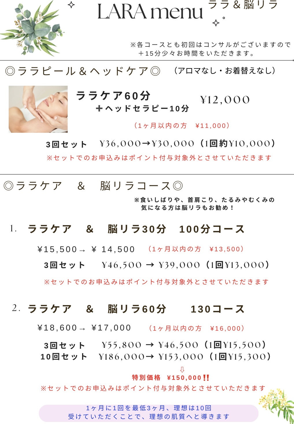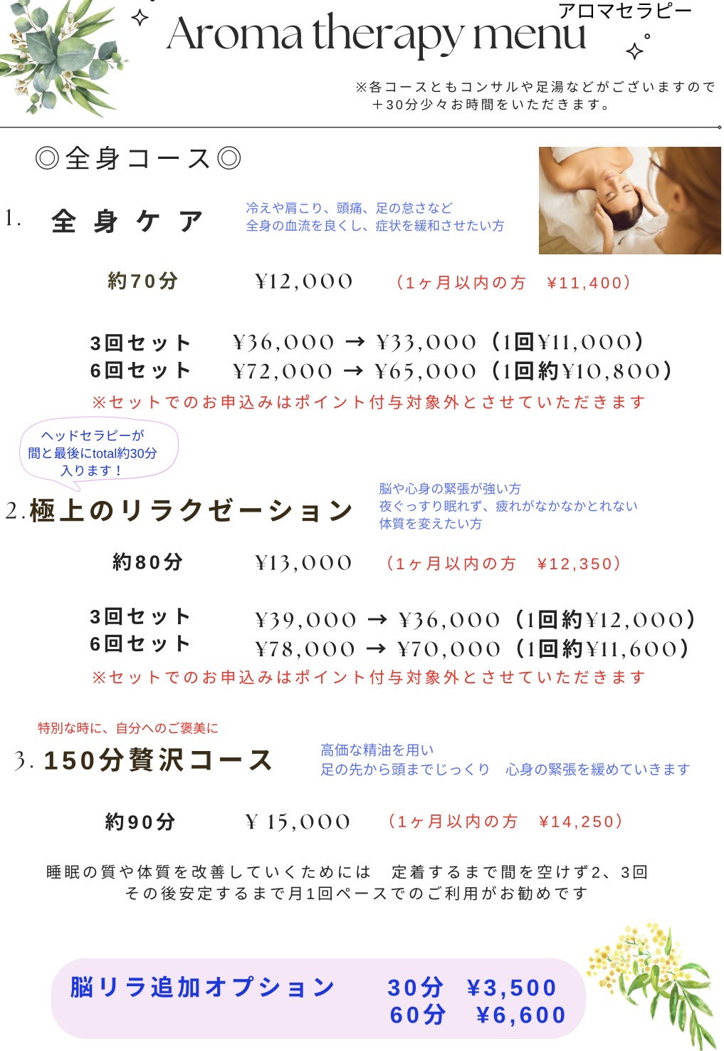 ※脳リラやララケアとの組み合わせメニューもありますので、気になる方はスタッフまで
